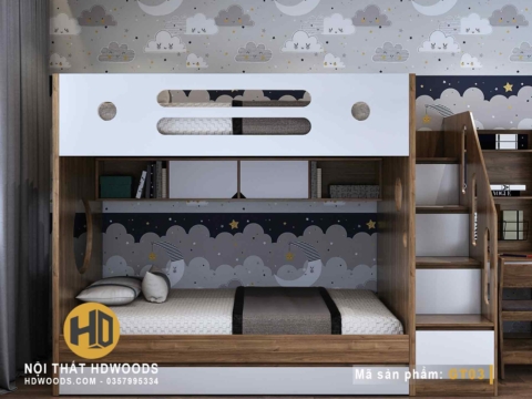 Một chiếc giường tầng cho bé với thiết kế đẹp mắt từ hãng HDWoods. Giường được trang bị cầu thang bên hông, giúp trẻ dễ dàng lên xuống mỗi tầng 1 cách nhanh chóng và an toàn. Cầu thang còn tích hợp các hộc tủ để đồ, giúp giường trở nên gọn gàng và tiết kiệm không gian.