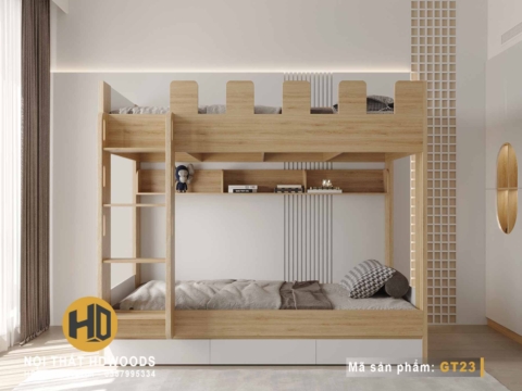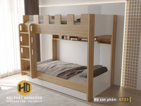 Giường tầng giá rẻ GT23 từ HDWoods có thiết kế tối giản nhưng vẫn tinh tế và tiện lợi. Mẫu giường này đi kèm với 3 ngăn kéo lớn giúp tăng thêm không gian lưu trữ. Tầng dưới được trang bị giá sách, giúp tối ưu hóa công năng sử dụng cho phòng ngủ. Với thiết kế đơn giản, giường tầng GT23 phù hợp cho mọi không gian phòng ngủ.