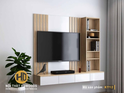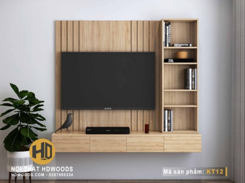 👉Kệ tivi KT12 được trang bị tấm gỗ ốp tường trang trí đẹp mắt, tạo nên không gian nội thất vô cùng độc đáo
