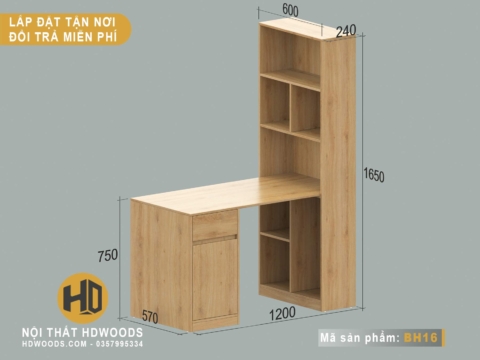 – Tiện dụng: mẫu bàn học đẹp BH16 là sự kết hợp một cách hài hòa và hoàn hảo giữa giá sách, hộc để đồ và bàn rất tiện dụng. Bàn được thiết kế khác biệt với giá sách được bố trí bên hông bàn “chẳng giống ai” nhưng lại rất thuận tiện cho trẻ lấy đồ mà không che mất hướng ánh sáng, nhất là khi bàn được kê sau cửa sổ. Bên cạnh đó, hệ thống tủ và ngăn kéo đặt bên dưới mặt bàn cũng vô cùng hữu ích khi làm tăng dung tích chứa đồ dùng, sách vở cho trẻ.
