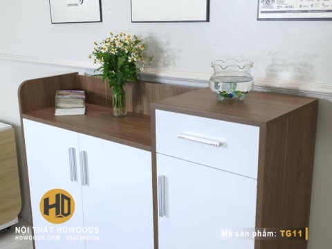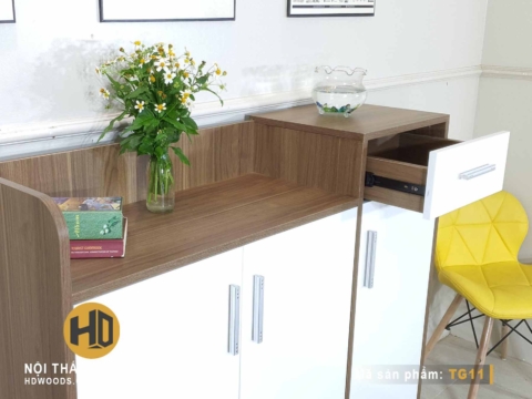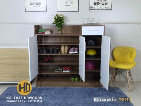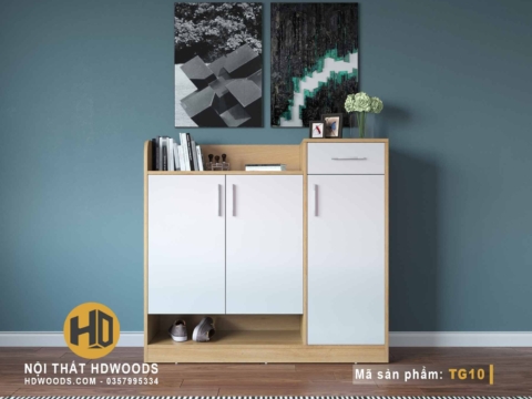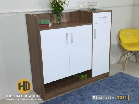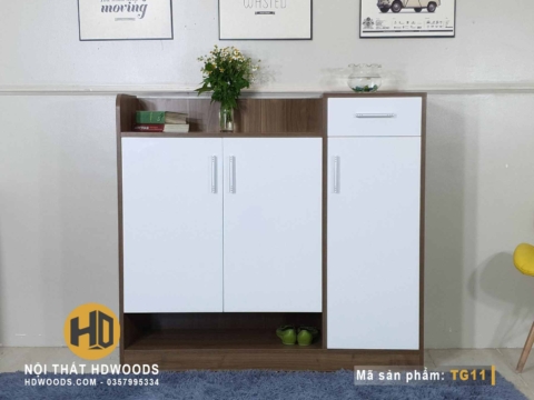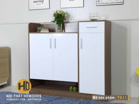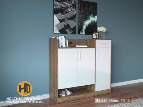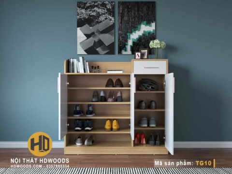 Ngoài chức năng để cất trữ, bảo quản những đôi giày của gia đình, tủ giày còn giúp làm đẹp không gian phòng khách , gây ấn tượng mạnh mẽ cho khách về sự ngăn nắp, sạch sẽ khi tới tham quan nhà. Tủ giày gỗ công nghiệp TG10 là một mẫu tủ đựng giày dép được ưa chuộng nhất của Nội Thất HDWoods.