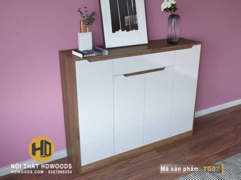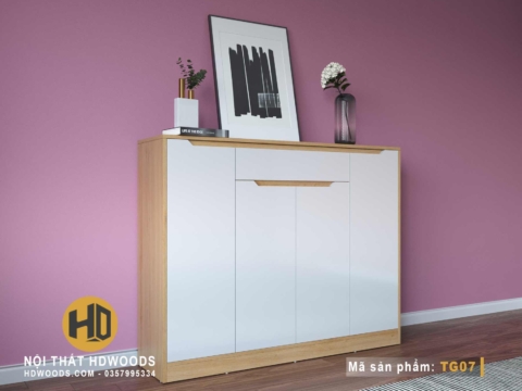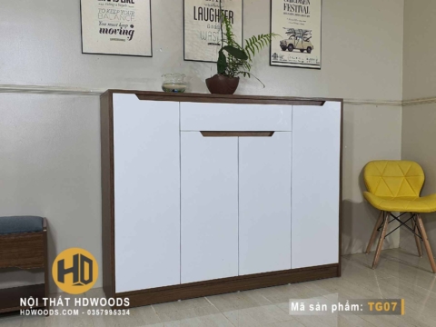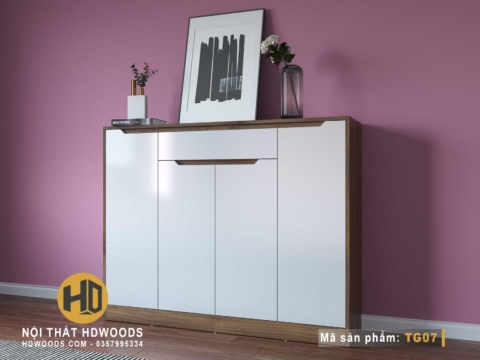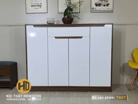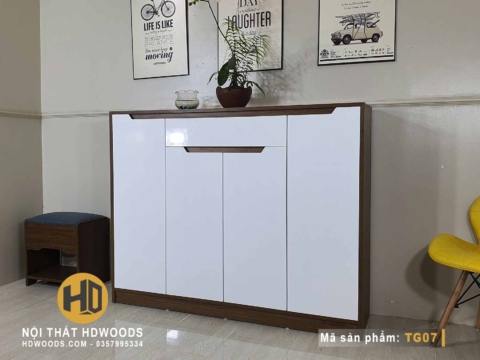 Tủ giày TG07 có thiết kế rộng rãi với chiều dài 1.4m, tích hợp 4 cánh mở kết hợp với ngăn kéo cho khả năng cất trữ giày dép lên tới 30 đôi, kể cả giày cao gót. Chiếc tủ này sẽ mang đến một không gian lưu trữ thoải mái cho người dùng.